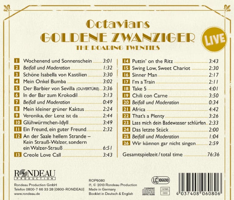 Goldene Zwanziger mit dem Vokalensemble Octavians – nach ihrer Debüt-CD Auftakt veröffentlichen die acht jungen Männer aus Jena jetzt ihre zweite CD. Wie der Titel verspricht dürfen bekannte Arrangements der Comedian Harmonists nicht fehlen. So stimmen die Sänger mit Wochenend und Sonnenschein, Schöne Isabella von Kastilien und Mein Onkel Bumba auf die Zeitreise in die goldenen Zwanziger ein. In dem Walzermedley An der Saale hellem Strande – Kein Strauß-Walzer sondern ein Walzer-Strauß parodieren die Octavians eine Vielzahl der bekanntesten Walzer und gipfeln in einer famosen Hommage auf die Jenaer Hymne An der Saale hellem Strande. Swing- und Jazz-Musik, die international in den 1920er Jahren ihre Blütezeit feierten, sowie Bearbeitungen bekannter Pop-Titel sind ebenfalls auf der aktuellen CD zu hören. Dabei greifen die Octavians auf eigens für sie bearbeitete Arrangements zurück: Indra Tedjasukmana, ein international erfolgreicher Vokalperkussionist, arrangierte den Jazz-Klassiker Take 5 von Paul Desmond. Dabei kosten die Octavians die freie Interpretation aus, um mit dem Klang und der Freiheit des A-cappella-Jazz zu spielen.