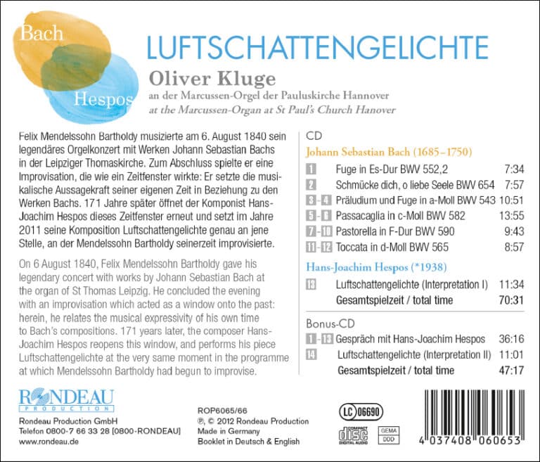 Felix Mendelssohn Bartholdy musizierte am 6. August 1840 sein legendäres Orgelkonzert mit Werken Johann Sebastian Bachs in der Leipziger Thomaskirche. Zum Abschluss spielte Mendelssohn Bartholdy eine Improvisation, die wie ein Zeitfenster wirkte: Er setzte die musikalische Aussagekraft seiner eigenen Zeit in Beziehung zu den Werken Bachs. Mendelssohns Konzertprogramm ist Grundlage für die neue CD: 171 Jahre später öffnet der Komponist Hans-Joachim Hespos dieses Zeitfenster erneut und setzt im Jahre 2011 seine Komposition Luftschattengelichte genau an jene Stelle, an der Mendelssohn Bartholdy improvisiert hatte. War Mendelssohn Bartholdy noch darum bemüht, die Zusammenhänge zur musikalischen Vergangenheit aufzuzeigen, Bachs Musik als lebendiges Erbe zu präsentieren, so geht es dem Komponisten Hespos vielmehr darum, die Un-Zusammenhänge aufzuzeigen. Luftschattengelichte besteht aus klanglichen Ereignissen, aus Klanginseln, deren Abfolge und innere Klanggestaltung weitgehend durch den Interpreten festgelegt werden können und müssen. Interpret der vorliegenden Ersteinspielung ist Oliver Kluge an der Marcussen-Orgel der Pauluskirche Hannover. Die Bonus-CD enthält ein Interview mit Hans-Joachim Hespos und eine zweite Fassung seiner modernen Komposition Luftschattengelichte.