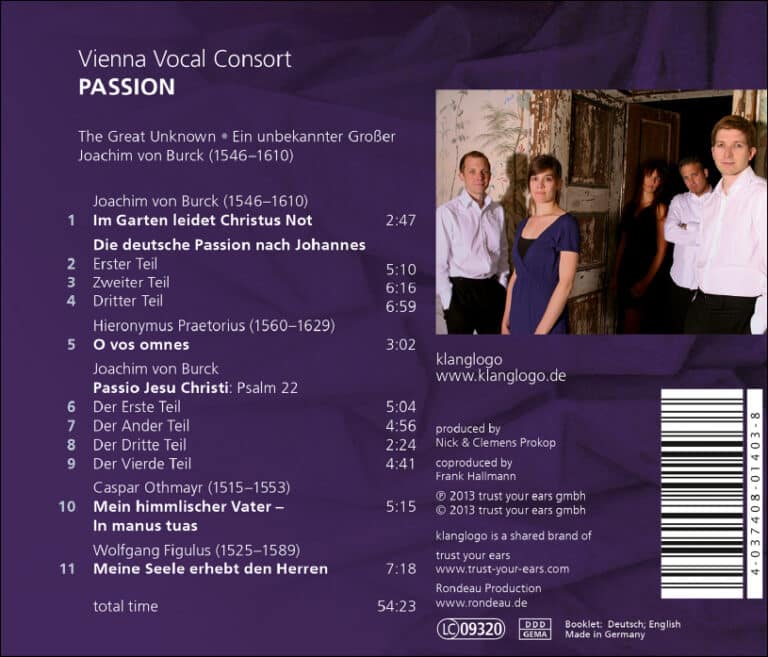 „Mehr davon!“ jubelten Kritiker über Vienna Vocal Consorts Byrd. Gerne! Jetzt präsentiert das Wiener Vokalensemble seine zweite Klanglogo-Produktion: Passion porträtiert Joachim von Burck als glutvollen Pionier protestantischer Kirchenmusik. Joachim von Burck (1546-1610) ist der große Unbekannte unter den nachreformatorischen Impulsgebern: Als Vorgänger von Johann Sebastian Bach an der Hauptkirche St. Blasius in Mühlhausen wurde er ein Pionier und Wegbereiter lutherischer Kirchenmusik. Als Komponist ein umfassend gebildeter Autodidakt, agierte er immer auf der Höhe seiner Zeit: Er griff in seinen Werken aktuelle Strömungen auf, um sie für neue Ausdrucksmöglichkeiten zu nutzen: Ein spannender Zeuge des übergangs. Bei Burcks Deutscher Passion handelt es sich um die wohl erste deutschsprachige Passionsvertonung der Musikgeschichte. Zusammen mit der Passio Jesu Christi nach dem 22. Psalm schließt das Vienna Vocal Consort damit wichtige Lücken im aktuellen CD-Repertoire. Das Vienna Vocal Consort (www.vocalconsort.at) zählt zu den renommiertesten Vokalensembles für Alte Musik in österreich. Seine Einzigartigkeit verdankt es auch den unkonventionellen Biografien der fünf Mitglieder.