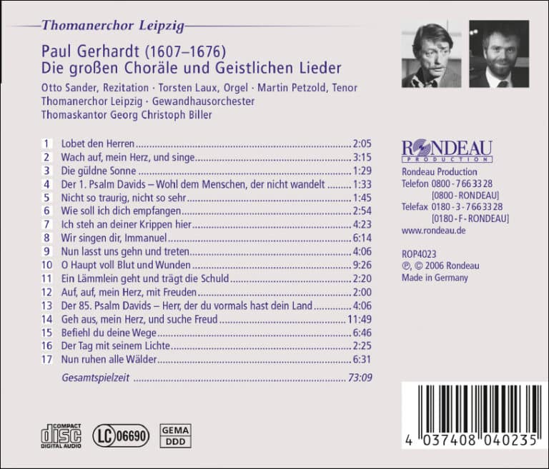 Die CD zum Paul-Gerhardt-Jahr 2007: Paul Gerhardt, einer der bedeutendsten Liederdichter der evangelischen Kirche, wurde vor 400 Jahren, am 12. März 1607, in Gräfenhainichen geboren. Viele bis heute beliebte Kirchenlieder stammen aus seiner Feder: Geh aus mein Herz, und suche Freud, Wie soll ich dich empfangen, Lobet den Herren, alle die ihn ehren oder Nun ruhen alle Wälder, auf unserer CD gesungen vom Thomanerchor Leipzig. Der bekannte Schauspieler Otto Sander trägt die barocken Gedichte ausdrucksstark und einfühlsam vor – Texte, die persönlich berühren. Torsten Laux improvisiert an der Orgel der Nikolaikirche in Berlin über die schönsten Melodien der Paul-Gerhardt-Lieder – in jener Kirche, in der Paul Gerhardt zwölf Jahre lang tätig war und große Teile seines barocken Liederschatzes schuf. Die vorliegende CD wurde zu einem der CD-Ereignisse des Paul-Gerhardt-Jahres und blieb drei Monate lang in den bundesweit offiziell ermittelten Klassik-Charts.