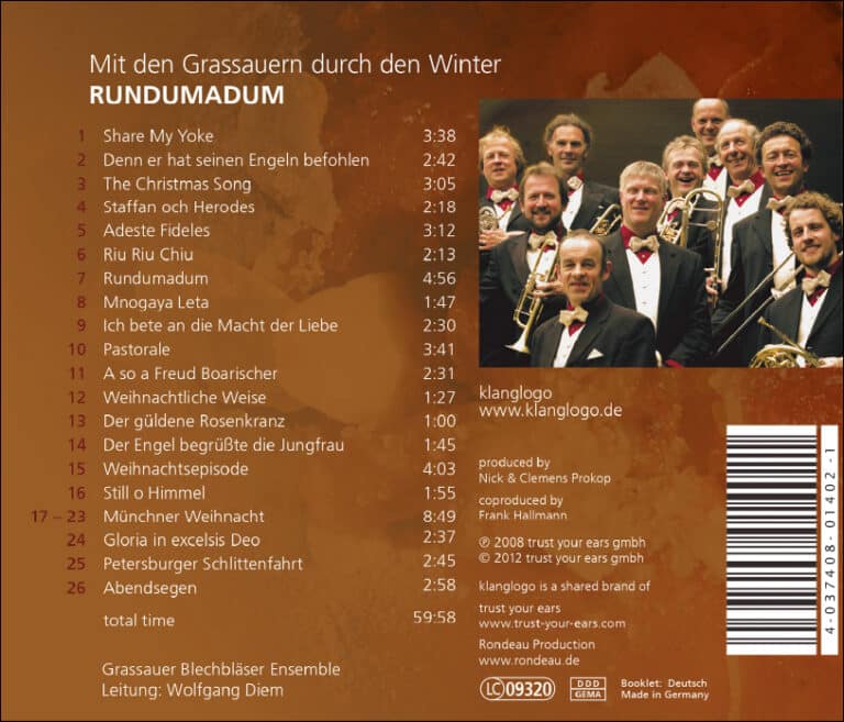 Mit den Grassauern durch den Winter: Die Grassauer – das ist längst ein Synonym für satten Bläsersound, witzige Interpretationen und eine unwiderstehliche Spielfreude. Mit Rundumadum präsentieren die Grassauer Blechbläser vom Chiemsee ihre schönsten Weihnachtsstücke. Es ist eine stimmungsvolle Reise durch den Winter. Und Brass at its best: Das zehnköpfige Ensemble spielt mit Gefühl, Witz, Charme und Meisterschaft. Authentisch alpenländische Musik bildet den Grundton von Rundumadum. Vor diesem Hintergrund spielen sie vom Alphorn bis zur Bach-Trompete, vom Choral bis zur Petersburger Schlittenfahrt ihre beeindruckende und ganz unverwechselbare Bandbreite aus. Der große Fankreis der Grassauer reicht dabei weit über die bayerischen Grenzen: „Von Bach bis Pärt verpacken die Grassauer Blechbläser Klassisches witzig-folkloristisch-bajuwarisch“, jubelte Die Zeit.