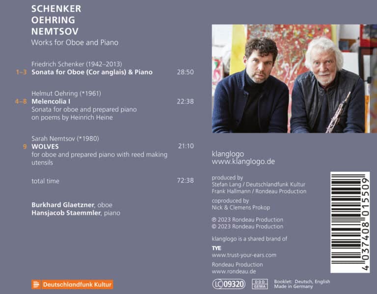 Drei höchst unterschiedliche zeitgenössische Werke interpretiert der Oboist Burkhard Glaetzner auf seinem Soloalbum. Gemeinsam mit Hansjacob Staemmler am Klavier hat er Werke von Friedrich Schenker (1942–2013), Helmut Oehring (*1961) und Sarah Nemtsov (*1980) eingespielt. Neben seiner solistischen Tätigkeit war Glaetzner als Professor für Oboe in Leipzig und in Berlin tätig; außerdem leitete er viele Jahre das Neue Bachische Collegium Musicum. Nun erweitert das Leipziger Label Klanglogo seine umfangreiche Discografie um ein spannendes Soloalbum: Schenkers Sonate für Oboe und Klavier fußt auf atonalen zwölftönig regulierten Strukturen, stützt sich aber gern auch auf traditionelle Modelle.