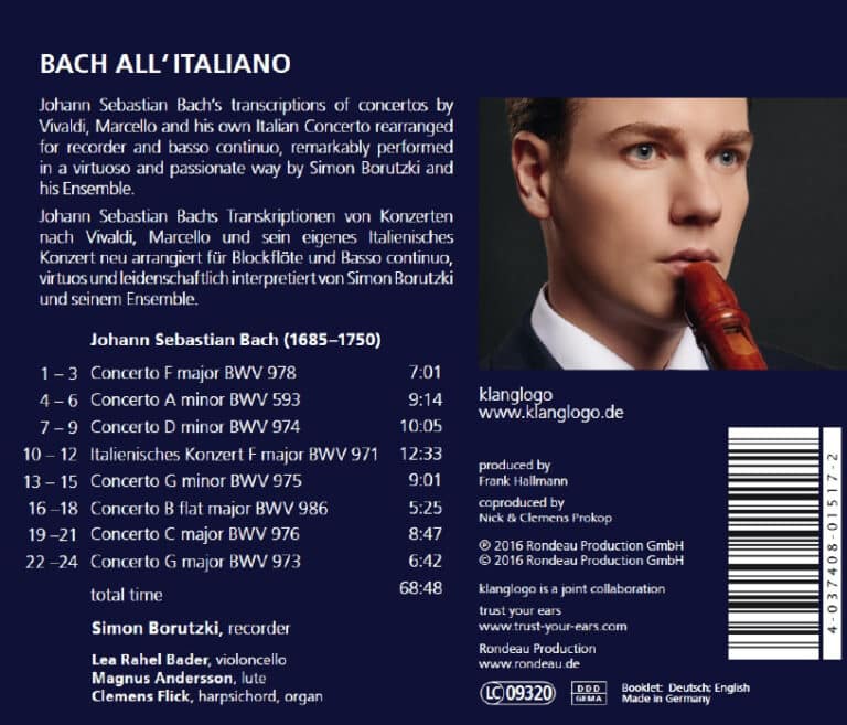 Johann Sebastian Bach dürfte der Komponist sein, dessen Musik im Laufe der Musikgeschichte am häufigsten bearbeitet und arrangiert wurde. Weniger bekannt ist, dass auch Bach selbst sich als Arrangeur von Musik aus der Feder anderer Komponisten betätigt hat. So hat er etwa die Violinkonzerte seiner italienischen Kollegen Alessandro Marcello (1673–1747) und Antonio Vivaldi (1678–1741) äußerst kunstvoll für Cembalo transkribiert, bei denen beide – Komponist und Bearbeiter – zu einer kongenialen Einheit zu verschmelzen scheinen. Für Bach all‘ italiano haben sich Flötist Simon Borutzki und Cembalist Clemens Flick diesen Bearbeitungen gewidmet und daraus Konzerte für Blockflöte mit Continuo-Ensemble arrangiert, die italienische Emotion und deutsche Satzkunst der bachschen Bearbeitungen beibehalten, und ihnen gleichzeitig die unnachahmliche Klangsprache der verschiedenen Flöten hinzugefügt. Denn wie sagte schon 1739 der Musikschriftsteller Johann Mattheson: „Entlehnen ist eine erlaubte Sache; man muss die Nachahmungen aber so ausarbeiten, dass sie ein schöneres und besseres Ansehen gewinnen als die Sätze, aus welchen sie entlehnet sind.“ Diese Maxime vor Augen zeigt der Flötist Simon Borutzki mit seinen acht Konzerten eine ganz neue und hochgradig individuelle Sicht auf Bachs Adaption des italienischen Stils.
