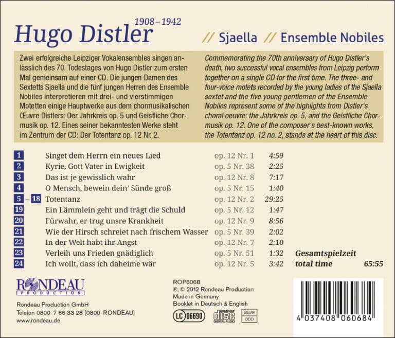 Zwei erfolgreiche Leipziger Vokalensembles singen anlässlich des 70. Todestages von Hugo Distler zum ersten Mal gemeinsam auf einer CD. Die jungen Damen des Sextetts Sjaella und die fünf Herren des Ensemble Nobiles interpretieren mit drei- und vierstimmigen Motetten einige Hauptwerke aus dem chormusikalischen ŒOeuvre Distlers: Der Jahrkreis op. 5 und Geistliche Chormusik op. 12. Eines seiner bekanntesten Werke steht im Zentrum der CD: Der Totentanz op. 12 Nr. 2. Der Totentanz op. 12 Nr. 2 umfasst 14 Spruchmotetten zum Ewigkeitssonntag, die Hugo Distler vertonte und die die musikalische Seite im Totentanz bilden. Den Spruchmotetten stellt Distler unvertonte Verse in Form eines Dialogs zwischen dem Tod und seinen jeweiligen Opfern zur Seite. Während bei der vorliegenden Aufnahme unter anderem die Sängerinnen und Sänger selbst die Rollen der Opfer sprechen, gibt Heinz-Martin Benecke dem Tod seine charakteristische Stimme. Bekannt ist der Totentanz vor allem durch seine, im 14. Jahrhundert aufgekommene, bildliche Darstellung der Macht des Todes über das Menschenleben in allegorischen Gruppen. So zeigt der Lübecker Totentanz Geistliche und Laien, vom Papst bis zum Kind, in absteigender Rangordnung und zwischen je zwei Personen eine tanzende Totengestalt mit umhüllendem Grabtuch.