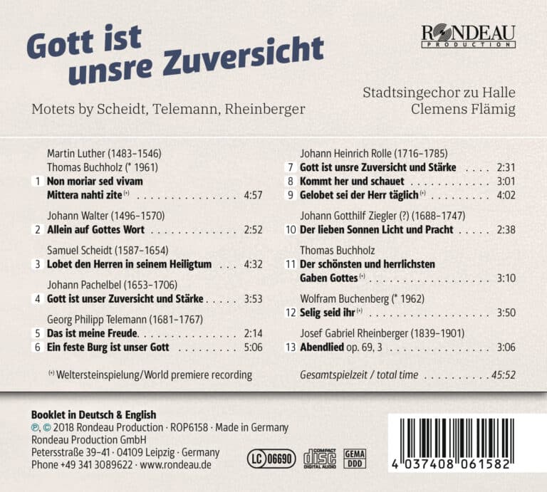 Knabenchöre haben einen besonderen Reiz. Sei es durch das besondere Timbre, die Frische der Männerstimmen oder der klare und helle Ton der Soprane, sei es durch das Vermögen, mit einem jugendlichen Klangkörper, auf hohem und professionellem Niveau zu musizieren. Der Stadtsingechor zur Halle, dessen Tradition bis 1116 zurückreicht, zählt heute zu den etablierten Knabenchören weltweit. „Gott ist unsre Zuversicht“ – unter diesem Motto verbindet das Programm der vorliegenden CD Chormusik vom 16. bis zum 21. Jahrhundert. Im Zentrum steht der 46. Psalm. Martin Luther hat diesen Psalm zu einem Lied umgearbeitet: „Ein feste Burg ist unser Gott“, das bis heute ein Symbol der Reformation geblieben ist. Beginnend mit der einzigen erhaltenen Motette von Martin Luther, über Johann Walter, Johann Pachelbel und Georg Philipp Telemann bis zu zeitgenössischen Werken von Thomas Buchholz und Wolfram Buchenberg entwickelt der Stadtsingechor zu Halle eine wunderbare stilistische und klangliche Vielfalt. Das berühmte „Abendlied“ von Josef Gabriel Rheinberger bildet den besinnlichen Abschluss des Programms. Ob Doppelchor oder vierstimmiger Satz, die jungen Sänger singen mit hoher Präzision und ausgewogener Klangschönheit.