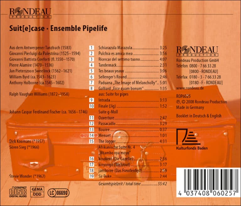 Rondeau Production gibt in dieser CD einen spannenden Einblick in die Welt der Blockflöten-Musik und macht dabei auf ein junges, sehr vielseitig begabtes Ensemble aufmerksam: das Blockflötenensemble Pipelife öffnet in seiner ersten CD buchstäblich sowohl den Instrumenten- als auch den Repertoirekoffer und bietet dabei einen Querschnitt durch die verschiedensten Stile und Epochen. Ohrwürmer des 16. Jahrhunderts, virtuose Tanzstücke aus Renaissance und Barock sind in diesem Streifzug durch die Musikgeschichte ebenso vertreten wie afrikanische Klänge und Pop-Hits aus den 1970er Jahren. Voller Klangfarbenreichtum und Spielfreude werden dabei Kompositionen unter anderem von Giovanni Pierluigi da Palestrina, Pierre Alamire, William Byrd, Dick Koomans und Stevie Wonder interpretiert. Von besonderer Bedeutung für das Ensemble ist die Suite for pipes von Vaughan Williams – stellt es doch das Gründungsstück und namensstiftende Element in der Geschichte von Pipelife dar. Das Ensemble Pipelife wurde 1999 gegründet und hat seitdem bei nationalen und internationalen Wettbewerben zahlreiche Preise und Stipendien erhalten.