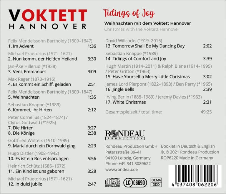 Wie funkelndes Sternenlicht durchzieht die frohe Kunde des Weihnachtsfestes Jahrhunderte der Musik – von Bethlehems Nachthimmel bis heute. In ihrem neuen Album „Tidings of Joy“ präsentieren die acht Sängerinnen und Sänger des Voktett Hannover eine Auswahl weihnachtlicher Musik in anspruchsvollen A-Cappella-Sätzen. Die Einspielung enthält Werke bekannter Meister der Musikgeschichte wie Felix Mendelssohn Bartholdy, Gottfried Wolters, Hugo Distler, Heinrich Schütz, Michael Praetorius, Max Reger und Peter Cornelius, in der Bearbeitung von Clytus Gottwald (*1925). Zeitgenössische Vertonungen und zugleich vertraute Melodien stammen unter anderem von Sebastian Knappe (*1989), David Willcocks (1919–2015), James Lord Pierpont (1822–1893) und Irving Berlin (1888–1989), in der Bearbeitung von Jeremy Davies.
