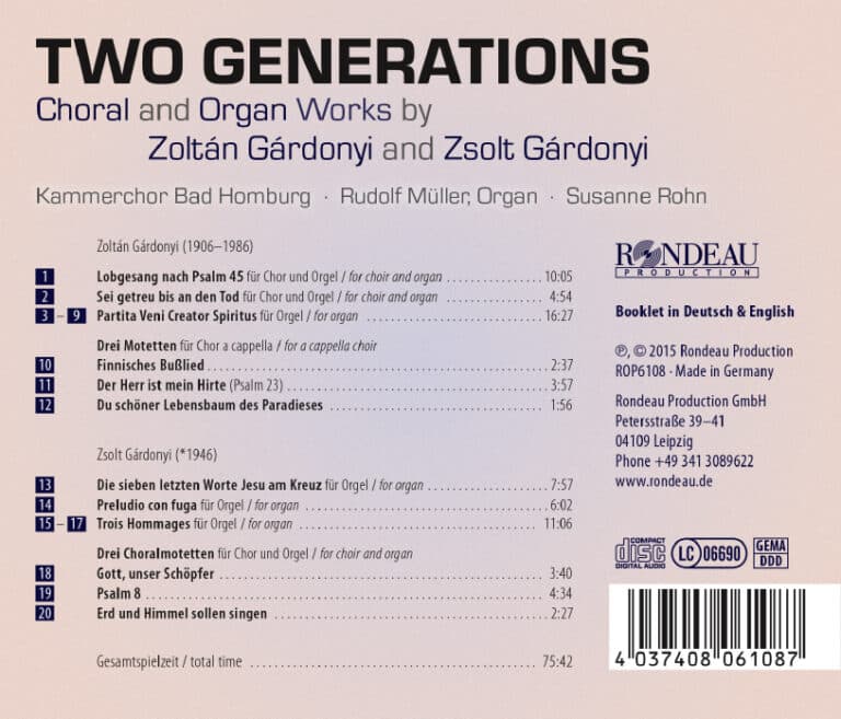 Wie der Vater, so der Sohn: Zoltán Gárdonyi (1906-1986) und Zsolt Gárdonyi (*1946) haben mehr gemein als ihren Nachnamen. Beide sind sie in Budapest geboren, gemeinsam prägen sie seit 70 Jahren die europäische Kirchenmusik des 20. Jahrhunderts. Zoltán Gárdonyi, der eine musikalische Ausbildung unter Zoltán Kodály, Paul Hindemith und Arnold Schering genießen durfte, gab sein Talent an seinen Sohn Zsolt weiter. Dieser hat nun Werke beider Generationen ausgewählt, um das Opus von Vater und Sohn zu porträtieren. In der Erlöserkirche Bad Homburg, einer atemberaubenden Kulisse mit ebenso guter Akustik, versammelten sich der Kammerchor Bad Homburg (Susanne Rohn) und Organist Rudolf Müller, um Two Generations auf einem Tonträger zu vereinen. Bekannte Melodien aus dem Evangelischen Gesangbuch in neuem Gewand treffen hier auf den monumentalen, manchmal fast schon bedrohlich wirkenden Klang der gewaltigen Sauer-Orgel der Erlöserkirche. Die Gegenüberstellung der beiden Gárdonyis lässt die feinen Unterschiede zweier sich ansonsten bemerkenswert ähnlichen Kompositionsstile erkennen. So wird Two Generations zu einem ganz besonderen Zeugnis jüngster Musikgeschichte: lebendig und klanggewaltig.