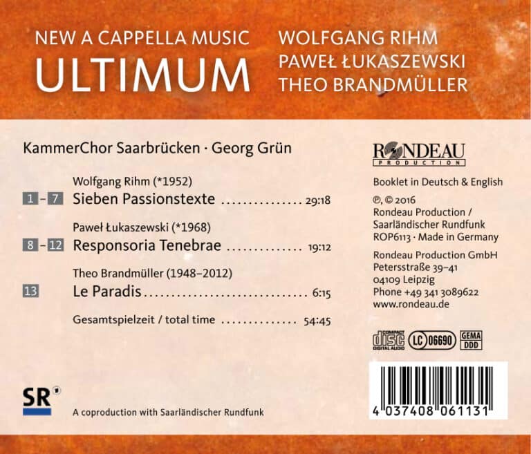 „In überirdisch schönen Tönen“ interpretiert der Kammerchor Saarbrücken unter Georg Grün selten eingespielte A-cappella-Chormusik von Wolfgang Rihm, Pawel Lukaszewski und Theo Brandmüller. Dabei führen die zeitgenössischen Werke, die einerseits in der Passionsmusik und andererseits im Requiem ihre textliche Grundlage haben, in unterschiedliche Klangwelten. Wie Kirchenfenster des 21. Jahrhunderts im gotischen Kirchenraum erscheinen Rihms Sieben Passionstexte – wahre Raritäten des A-cappella-Repertoires –, mit denen er gekonnt eine musikalische Brücke von der Gegenwart zur klassischen Vokalpolyphonie schlägt. Dagegen fasst Lukaszewski seine Responsoria Tenebrae auf ausgewählte Bibelworte der vorösterlichen Trauerwoche in raumgreifenden Texturen um, die in ihrer Klangfarbigkeit und -schönheit den Trauerduktus der Passion unterstreichen. Und welche technisch wie kompositorisch höchst komplexe und anspruchsvolle Werke der Kammerchor Saarbrücken zu meistern vermag, offenbart die Interpretation von Brandmüllers Le Paradis. Vollendet durch Chorleiter Georg Grün bildet dieses Opus Ultimum den Zielpunkt der Aufnahme, mit der die versöhnliche Begegnung mit dem Tod gelingt, eben „in überirdisch schönen Tönen“.