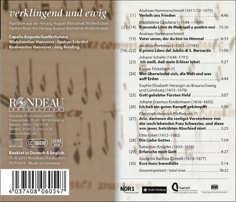 Der Mädchenchor Hannover und der Knabenchor Hannover setzen Repertoire bildende Akzente. Mit ihren Einspielungen von Auftragskompositionen wie von Wiederentdeckungen haben sie sich ein hohes Renommee erworben. Auf der vorliegenden Einspielung haben sie für Rondeau Production und den Norddeutschen Rundfunk einige Raritäten aus der Herzog August Bibliothek Wolfenbüttel eingespielt. Die CD führt in die Jahre 1566 bis 1701, und sie führt in die höfische Kultur von Wolfenbüttel, in die Kultur der protestantischen Städte Freiberg, Helmstedt, Leipzig, Lüneburg, Minden, Nürnberg, Tonna (Thüringen) sowie nach Italien. Sie gibt damit Einblick in die Musik aus der Entstehungszeit der Herzog August Bibliothek Wolfenbüttel und spiegelt die Repräsentations- und Funeralkultur dieser Zeit. Die neue CD enthält Kompositionen von Andreas Hammerschmidt, Maddalena Caulana, Jacobus Peetrinus, Johann Schelle, Otto Gibel und weiteren.