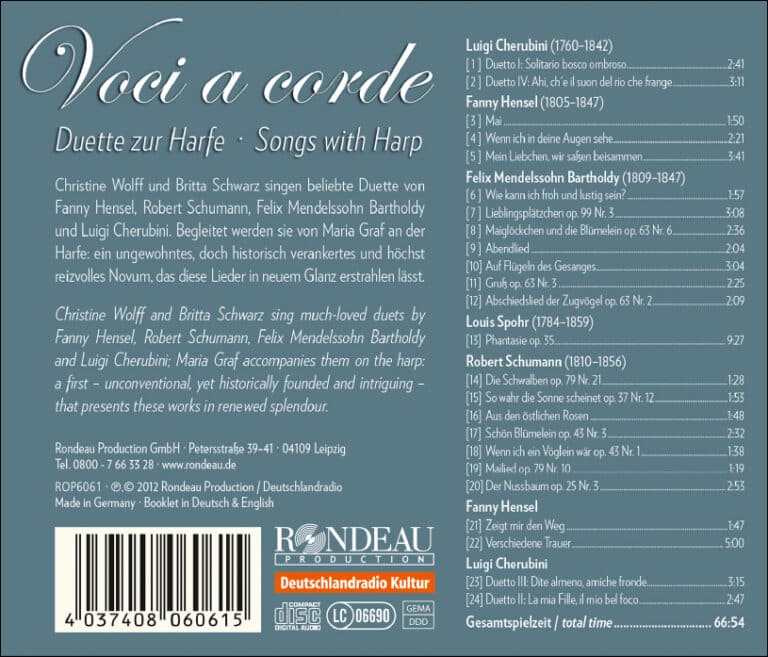Das Kunstlied des 19. Jahrhunderts ist geprägt von Kompositionen Robert Schumanns, Felix Mendelssohn Bartholdys oder auch Fanny Hensels, und spiegelt den romantischen Geist jener Jahre wieder. Rondeau Production nähert sich diesem gemeinsam mit den Solisten Christine Wolff, Britta Schwarz und Maria Graf auf eine neue Weise: Mit der Harfe als Liedbegleitung erklingen bekannte und unbekannte Duette in neuem Gewand und der Geist der Haus- und Kammermusik wird wiederbelebt. Denn für diesen Rahmen sind die meisten der ausgewählten Lieder komponiert worden, und es ist ein Anliegen der Interpreten, von der großen Kunstgeste abzusehen und das Singen zu Zweit oder zu Dritt wieder etwas normaler und selbstverständlicher zu machen. Herauszuheben ist die Einspielung vier selten eingespielter Lieder von Luigi Cherubini, die für die Besetzung mit zwei Frauenstimmen und Harfe komponiert wurden. Als Soloinstrument tritt die Harfe mit der Phantasie op. 35 von Louis Spohr in Erscheinung.