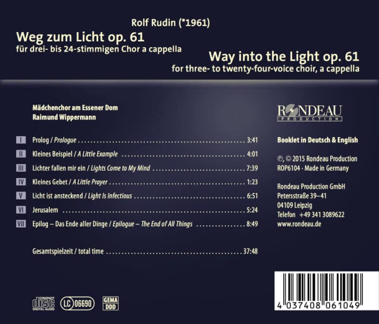 Maßgeschneiderte Anzüge passen in der Regel wie angegossen. Und ähnlich verhält es sich auch mit Kompositionen, die speziell für einen ganz bestimmten Chor geschrieben worden sind. Nur wenigen wird dieses Glück zuteil, aber wenn es eintrifft, wenn Komponist und Chor eng zusammenarbeiten und sich ganz auf einander einlassen, ist dies stets die Geburtsstunde einer ganz besonderen Musik. Der Mädchenchor am Essener Dom unter Professor Raimund Wippermann durfte dieses Glück erfahren. 2001 wollte der deutsche Komponist Rolf Rudin eigentlich ein Stück schreiben, das von möglichst vielen und ganz unterschiedlichen Chören gesungen werden könne. Nach dem Besuch einer Probe des Mädchenchors am Essener Dom jedoch änderte er seine Pläne und schuf mit Weg Zum Licht einen Motettenzyklus für Frauenchor a cappella, der Raimund Wippermann und seinen Sängerinnen wie auf den Leib geschneidert ist. Aus einem reichhaltigen Pool an Textquellen schöpfend, schuf Rudin eine siebenteilige Textkomposition, deren Sätze konzentrisch auf einander Bezug nehmen. In Musik gesetzt gelang es ihm so, ein inhaltlich wie musikalisch hochkomplexes Klanggebäude zu konstruieren, in dem der Evangelist Johannes ebenso zu Wort kommt wie Dietrich Bonhoeffer und Erich Fried.