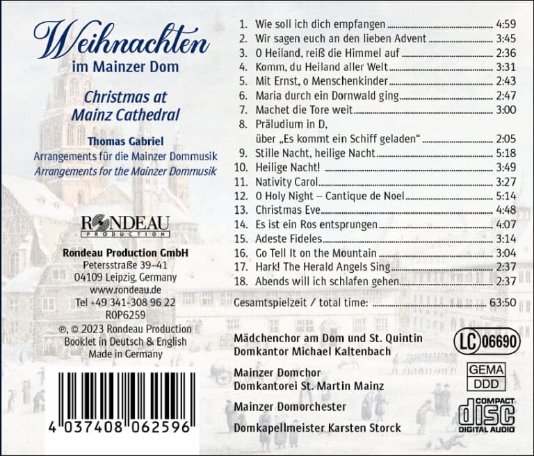 Die Chöre am Mainzer Dom präsentieren ein zauberhaftes Album mit Weihnachtsliedern, die eigens von Thomas Gabriel arrangiert wurden. Gabriel ist bekannt für seine einfühlsame Stilistik, die traditionelle Weihnachtsklänge mit modernen Nuancen verwebt. Seine Arrangements verleihen den Liedern eine zeitgemäße Note, ohne dabei die klassische Schönheit der Originalkompositionen zu verlieren. Dies gibt dem Album eine besondere künstlerische Tiefe und macht es zu einem unvergesslichen Hörerlebnis während der festlichen Saison. Ein festliches Weihnachtsalbum mit dem Mainzer Domchor, der Mainzer Domkantorei, dem Mädchenchor am Dom und St. Quintin unter der Leitung von Domkantor Michael Kaltenbach und dem Mainzer Domorchester unter der Gesamtleitung von Domkapellmeister Karsten Storck.
