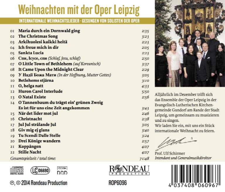 Die Oper Leipzig feiert Weihnachten – und zwar im gemütlichen, familiären Rahmen. Abseits von strahlenden Konzertsälen und großem Publikum trafen sich die Stars der Bühne in der beschaulichen Gundorfer Kirche, um abseits vom Scheinwerferlicht gemeinsam zu musizieren. Nun wurde diese einmalige Atmosphäre einmal eingefangen, und unter der musikalischen Leitung von Christian Hornef singen Solisten aus aller Welt die Weihnachtslieder, die ihnen am meisten am Herzen liegen. Begleitet von der Orgel, vom Klavier oder auch vom Mendelssohn-Quartett präsentieren Tuomas Pursio ein finnisches, Eun Yee You ein koranisches und Martin Petzold ein deutsches Weihnachtslied und erklären, was ihnen diese Kleinode bedeuten. Auf diese Weise lassen sich nicht nur wunderbare, bekannte wie unbekannte Weihnachtslieder ganz neu entdecken. Diese CD gewährt dem Zuhörer ebenso einen äußerst seltenen, sehr privaten Einblick in das musikalische Gefühlsleben weltberühmter Opernstars. Teil solistisch, teils im Ensemble tragen Lieder wie „Maria durch ein Dornwald ging“, „Jul Jul stralande Jul“, „O Natal Existe“ und ’stille Nacht“ die gesamte Größe der Oper Leipzig zusammen – und führen sie gleichzeitig ganz weit fort: In die romantische Abgeschiedenheit der kleinen Gundorfer Kirche.