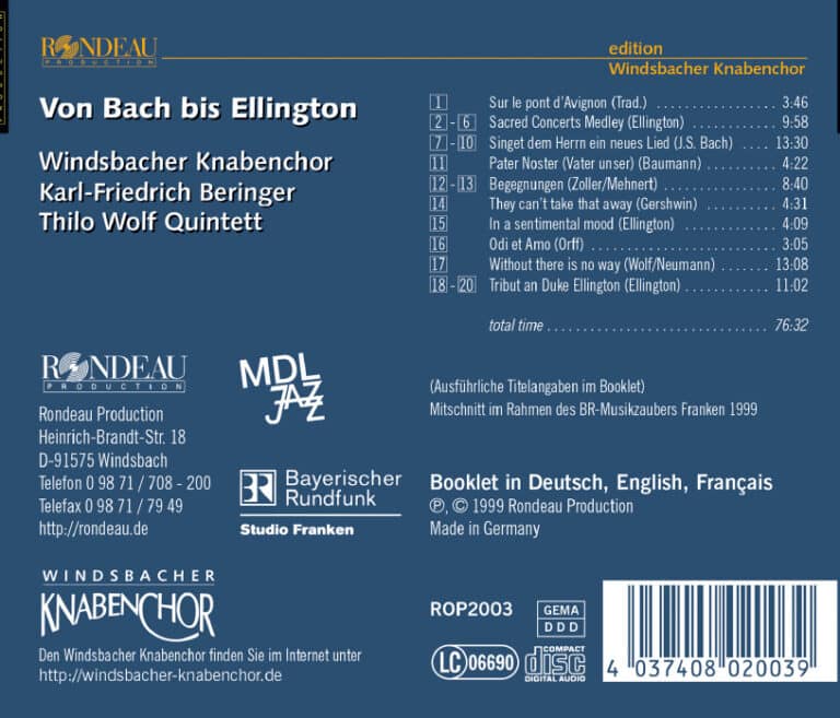 Von Bach bis Ellington – so der Titel dieser CD, mit der sich der Windsbacher Knabenchor auf ein für ihn absolut neues Terrain begibt. Erstmals musiziert der evangelische Chor gemeinsam mit einer Jazzband, dem renommierten Thilo Wolf Quintett. Eine gleichnamige Fernsehsendung hat das Bayerische Fernsehen ausgestrahlt. Es geht um die Begegnung zweier musikalischer Welten: die traditionsreiche, vom Windsbacher Knabenchor gepflegte Musica Sacra mit dem jüngeren Jazz – eine seiner Wurzeln, das Spiritual, verweist ebenfalls auf die geistliche Musik. Thomas Zoller widmet den beiden Ensembles seine Suite Begegnungen. Daneben bilden Arrangements von Duke Ellington, Carl Orff, George Gershwin und anderen das Repertoire für die vorliegende CD.