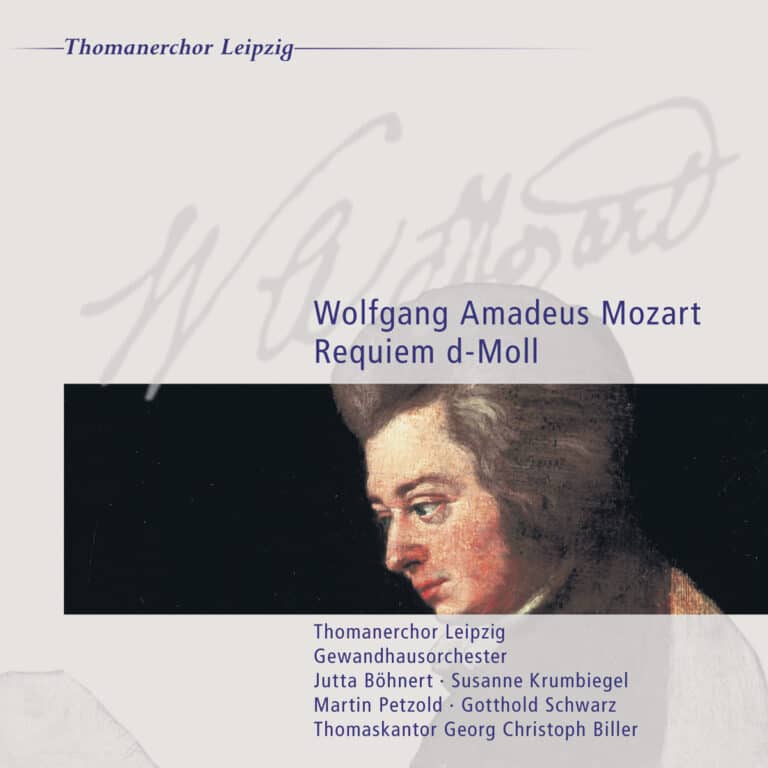 Mozart und der Thomanerchor: Keine ungewöhnliche Liaison. 1789 hört Wolfgang Amadeus Mozart den Thomanerchor in der Leipziger Thomaskirche. Von Bachs Motette Singet dem Herrn ein neues Lied ist er begeistert und lässt sich die Noten geben. Für die Thomaner bedeutete das Mozartjahr 2006 ein doppeltes Jubiläum: Am 27.Januar 1756 erblickte Wolfgang Amadeus Mozart das Licht der Welt, vor genau 250 Jahren. Und vor 210 Jahren, nur fünf Jahre nach dem Tod des jungen Komponisten, musiziert der traditionsreiche Thomanerchor zum ersten Mal sein berühmtes Requiem. Thomaskantor Johann Adam Hiller leitete diese historische Aufführung. Noch auf dem Sterbebett hatte Mozart an der Partitur seines Requiems gearbeitet. Zum Mozartjahr 2006 erscheint eine CD-Neueinspielung des Requiems in hochkarätiger Besetzung. Neben dem Thomanerchor Leipzig und dem Gewandhausorchester musizieren renommierte Solisten unter der Leitung von Thomaskantor Georg Christoph Biller.