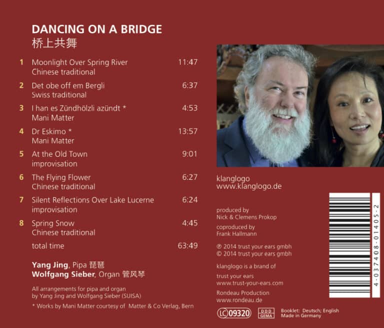 Auf seinem „Bummel durch Europa“ spottete Mark Twain über die mächtige Luzerner Hoforgel als Touristenattraktion. In DANCING ON A BRIDGE wird sie zum Schauplatz für eine atemberaubende Begegnung zwischen Ost und West: Die filigrane chinesische Laute Pipa mit ihren subtilen Zwischentönen trifft auf das 20-Tonnen-Instrument mit seiner 350-jährigen Geschichte. Hinter der CD-Einspielung stehen zwei Musiker ersten Ranges: Yang Jing ist die ungekrönte Königin der Pipa – „eine Virtuosin von Heifetz-ähnlicher Qualität“ (Sunday Telegraph). Ihre Interpretation des Klassikers „Moonlight“ zählt 1,2 Mio Youtube-Klicks. Der Luzerner Stiftsorganist Wolfgang Sieber ist eine Institution des Schweizer Musiklebens und berühmt dafür, mit gleicher Leidenschaft „Red Bull Flying Bach“ und echte Volksmusik zu begleiten; seine Einspielungen aus dem ’seiberspace“ besitzen Kultstatus. Für DANCING ON A BRIDGE entstanden einzigartige Bearbeitungen chinesischer Meisterwerke und schweizerischer Schnurren. Aus dem Kontrastreichtum der beiden Instrumente entstanden unglaublich ansprechende „Lieder ohne Worte“: Klangwelten sowohl für die poetische Bildsprache chinesischer Dichtung als auch die messerscharf pointierte Balladenkunst der Schweizer Liedermacher-Legende Mani Matter.